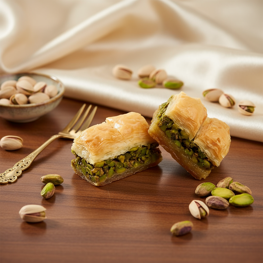 Die reichhaltige Pistazienfüllung wird von dünnen Schichten goldenen, buttrigen Teigs umhüllt, der auf der Zunge zergeht. Jedes Stück bietet die perfekte Balance zwischen Knusprigkeit und Weichheit, mit einer Süße, die nie überwältigend wird.