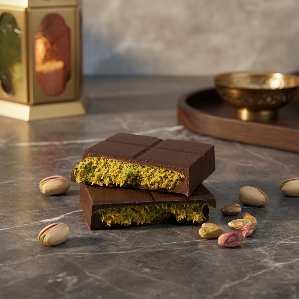 Die reichhaltige Pistazienfüllung wird von einer Schicht dunkler Schokolade umhüllt, die die Süße perfekt ausbalanciert. Die Kombination aus knusprigem Kunafa-Teig und cremiger Pistazienfüllung schafft einen raffinierten Geschmack, der nie überwältigend wird.