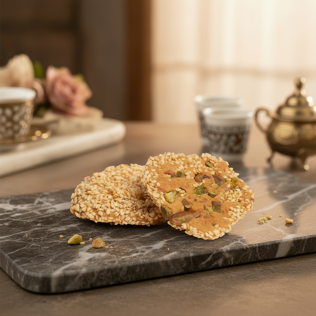 Sesamkekse mit Pistazien (Barazek) sind eine klassische orientalische Delikatesse, die über Generationen hinweg verfeinert wurde. Jeder Keks wird sorgfältig von Hand mit nur Premium-Zutaten für ein unvergessliches Geschmackserlebnis hergestellt.